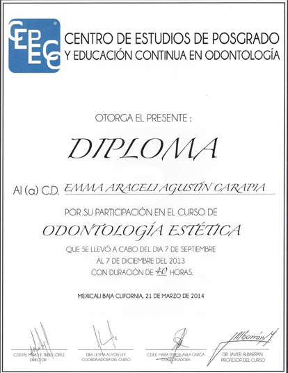 • Diplomado en Implantología, Universidad Autónoma de Baja California.